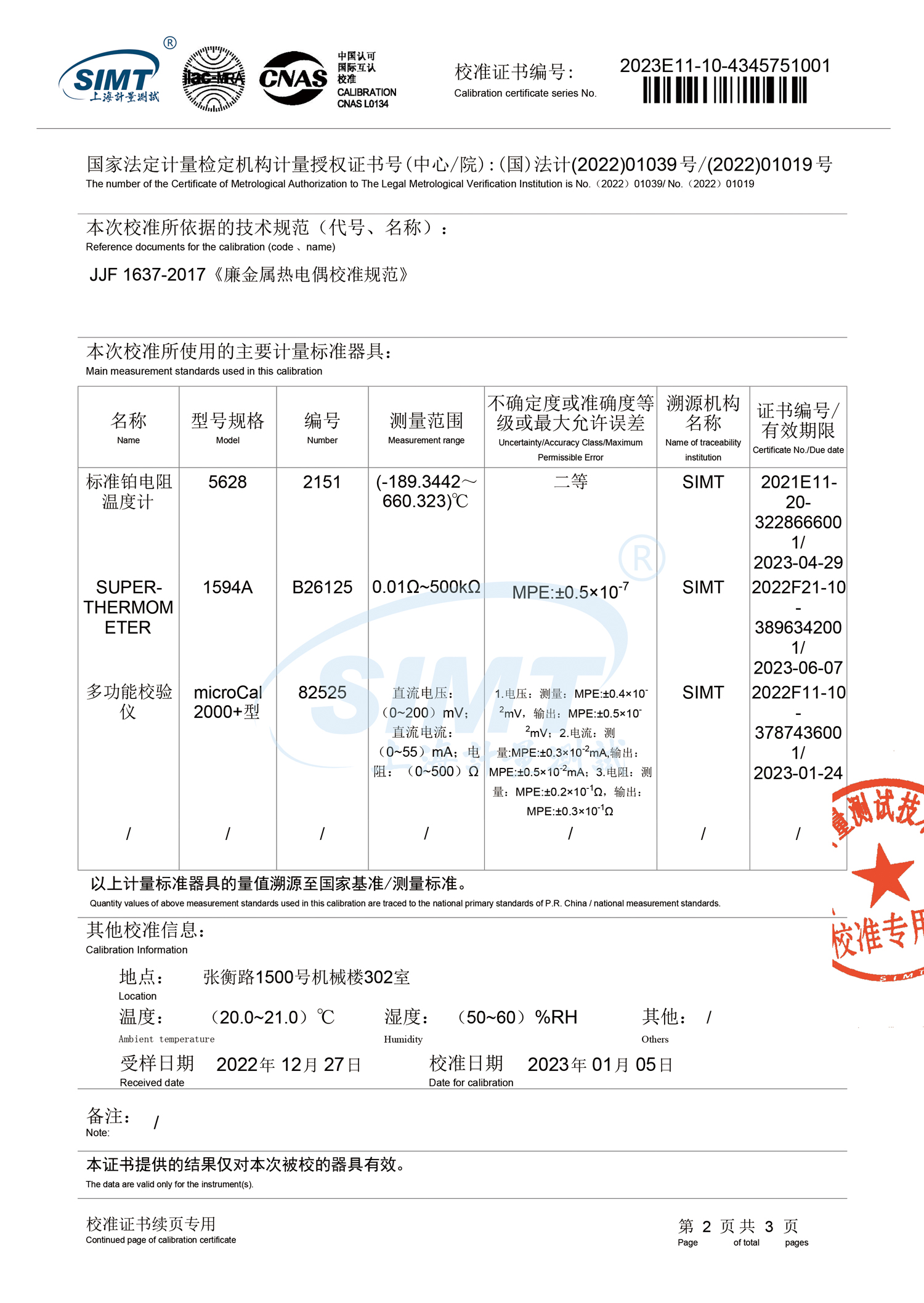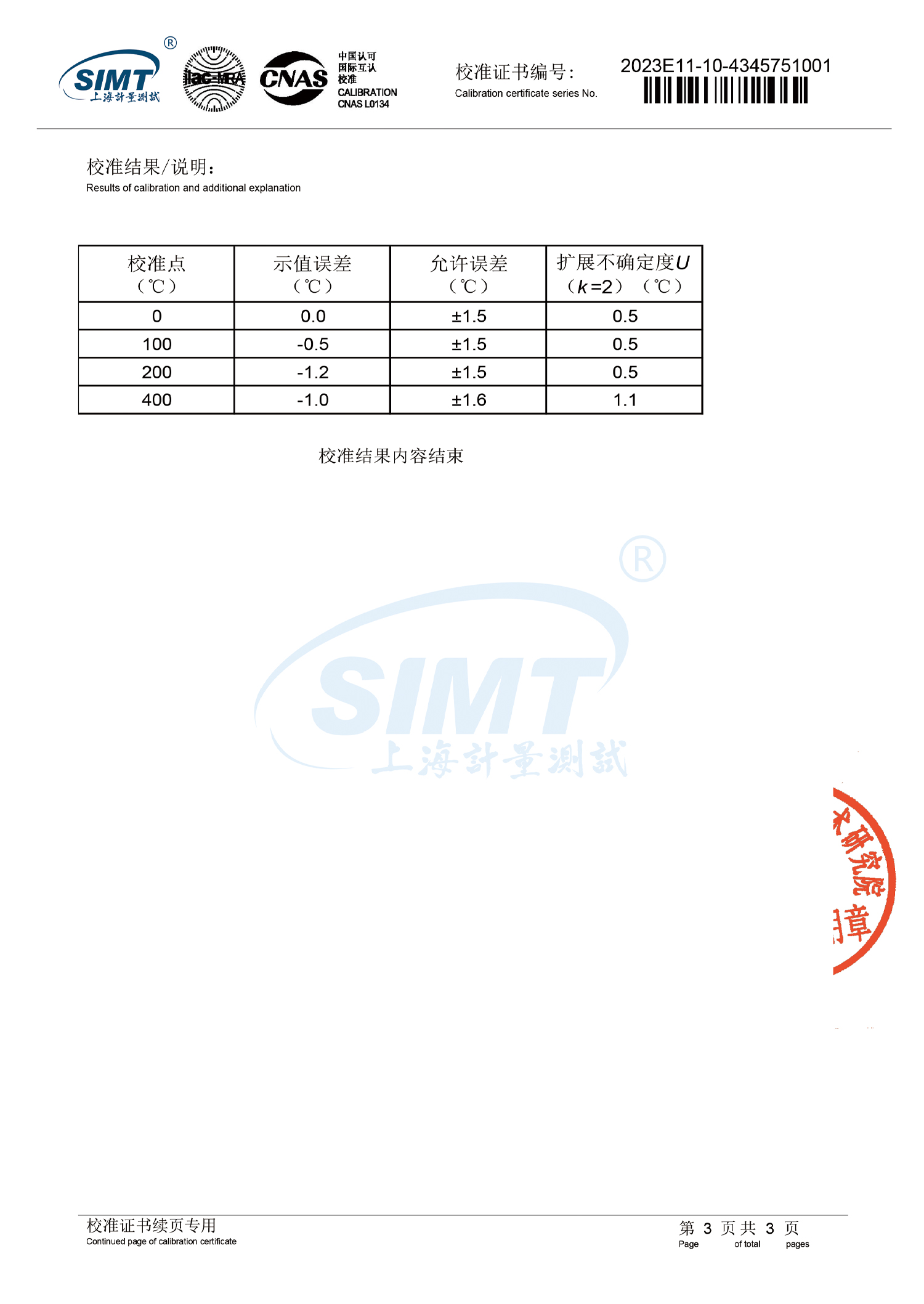 拓群機(jī)電熱電偶校準(zhǔn)證書(shū)I級(jí)精度
